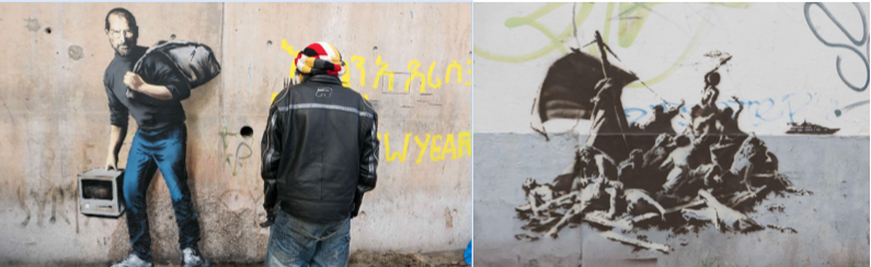 This new work shows Cosette, the character synonymous with the book and musical Les Misérables. The original artwork shows Cosette with the French tricolor waving behind her. The image of the girl was originally from an illustration in Les Misérables, but the flag was added to promote the musical in the West End of London. However, Banksy has taken the girl’s surroundings and made a new meaning out of it. Now, Cosette is surrounded by teargas, as evidenced by the open can spraying it at her feet. Cosette’s eyes are red and there are tears running down her face. Banksy most likely did this because of the recent surge in police brutality in Europe as a response to the wave of Middle Eastern refugees and asylum-seekers. Specifically, it is a reference to the French police’s use of teargas while clearing a refugee camp in Calais. This work of graffiti comes about a month and a half after Banksy visited Calais, near the aforementioned refugee camp, and he left us with a few more images. In one, Steve Jobs carries a rucksack or a garbage bag filled with belongings like a refugee, and in another, the silhouette of the Raft of Medusa, the famous painting by Théodore Géricault, with the passengers trying to wave down a cruise ship as if they had just escaped from Syria and were drifting endlessly somewhere in the Mediterranean.