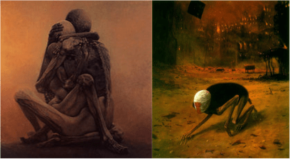 Beksiński’s work falls under the strange category of dystopian surrealism. Dark, deathly landscapes with skeletal figures, features of modern gothic art, and lots of sinister sfumato. One of the main antagonists in Stranger Things is an otherworldly monster known as the Demogorgon to the nerdy kids. Films like Alien, Predator, and Jaws all contributed some of the individual characteristics of this monster. But, the figures found in Beksiński’s work also shows these malformed humanoid creatures with spindly arms and legs, along with toned but eerily pallid skin. The concept artists who worked on Stranger Things cite many things as contributive to the final product, but that Beksiński’s art really provokes this ethereal hell that the Duffer Brothers had in mind for the Upside Down. But Stranger Things isn’t the only place where Beksiński’s influence can be seen. Anyone who knows of the menacing films of Guillermo del Toro will undoubtedly has seen Beksiński being channeled, from Hellboy to Pan’s Labyrinth.